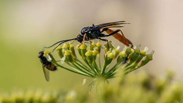 Wasps (Hymenoptera) are flying creatures that are typically omnivorous and classified according to whether they live in large social colonies or maintain a solitary existence. Although similarities exist with bees, wasps have several distinct characteristics. For example, bees typically have a round body style, while wasps have a long, slender frame connected by a thin “waist-like” petiole. Further, wasps usually have a smooth exterior, unlike the hairier body of bees.